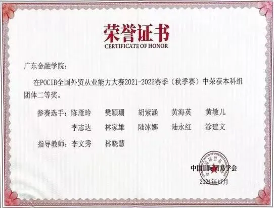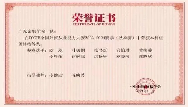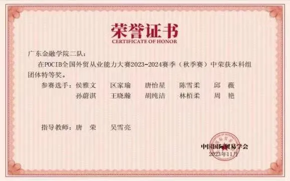为促进我校应用型人才培养模式和实践教学的改革,Beat365中文官方网站组织学生参加由中国国际贸易学会主办的POCIB全国外贸从业能力大赛,大赛内容覆盖外贸业务全流程,来自全国外经贸院校的学生同台竞技,全方位培养外贸型人才。Beat365官网学生分别在2021年、2023年比赛中获得全国团体二等奖、全国团体特等奖,在2024年获得全国团体特等奖1项、一等奖2项,个人一等奖9项、个人二等奖10项、个人三等奖11项。这充分展现出Beat365官网国贸专业应用型人才培养的实力和水平。