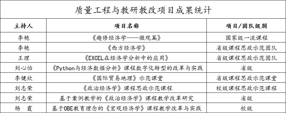 近年来,学院全体教职工以立德树人为根本任务,以培养高素质复合型人才为己任,凝心聚力、创新发展,为建设有特色的高水平Beat365中文官方网站和打造广东省一流经济学科而努力奋斗。学院现建有1门国家级一流课程《趣修经济学》、1门省级一流课程《EXCEL在经济学分析中的应用》,拥有《经济学原理》、《政治经济学》2个省级教学团队,还开设有《走遍世界说贸易》、跨境电商第二课堂《亚马逊运营思维与实操策略》、《企业家讲经济》等产教融合特色课程,以及4门线上线下混合式课程;教学质量稳步提高,在广东省第一届高校青年教师教学基本功大赛中获得2等奖1次,在广东省高校青年教师教学大赛中有2人获得一等奖、3人获得二等和三等奖,在广东省本科高校在线教学优秀案例比赛中有3人获得一等奖、1人获得二等奖。