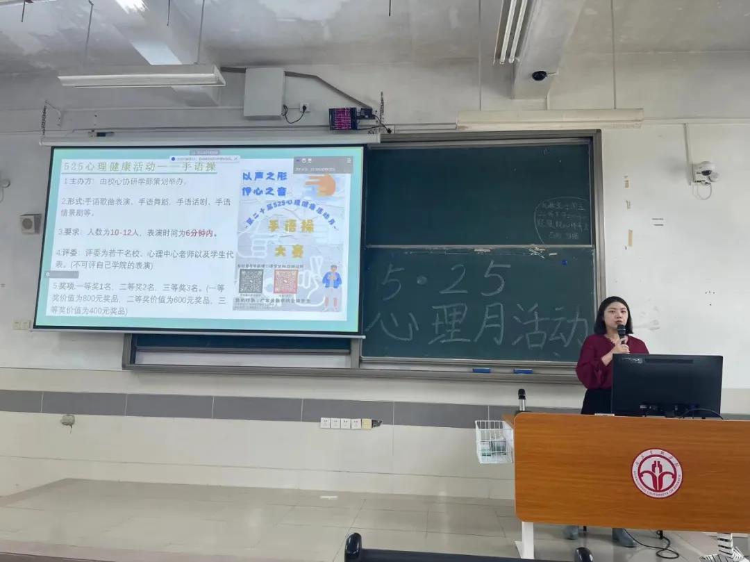 老师强调,手语操可以有效缓解压力、放松身心;随后动员各班心理委员发动班级同学积极参加手语操活动。