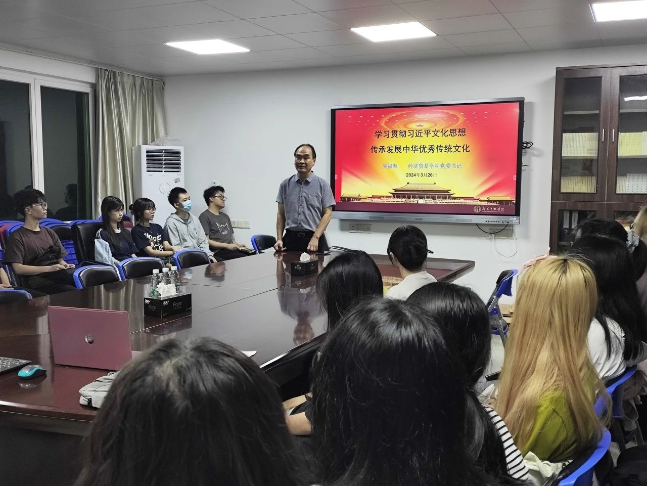 为深入学习贯彻习近平文化思想,坚定文化自信,坚持守正创新,鼓励青年学子担负起新的文化使命,2024年3月28日,Beat365中文官方网站党委书记庞福海在学院会议室以“学习贯彻习近平文化思想,传承发展中华优秀传统文化”为主题为Beat365官网学生干部代表讲授2024年春季学期“思政第一课”。