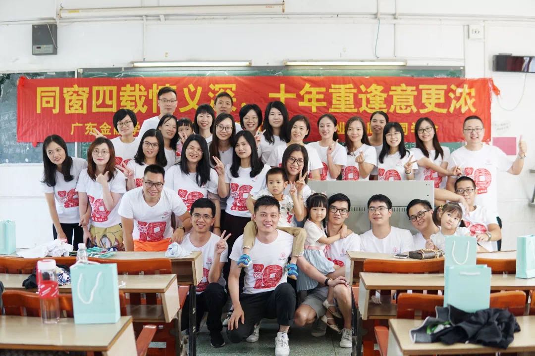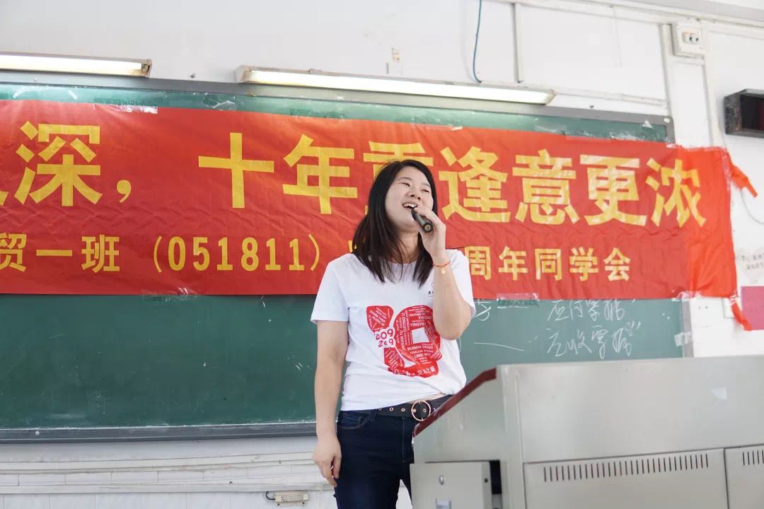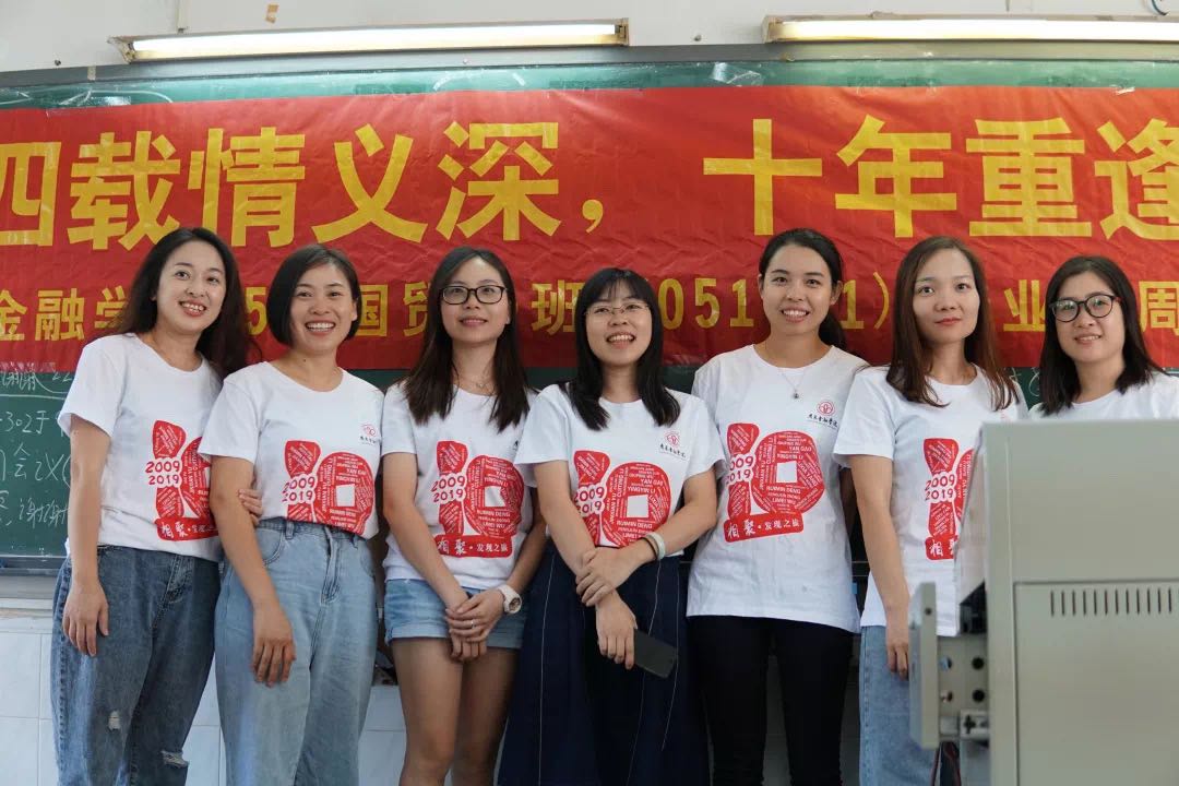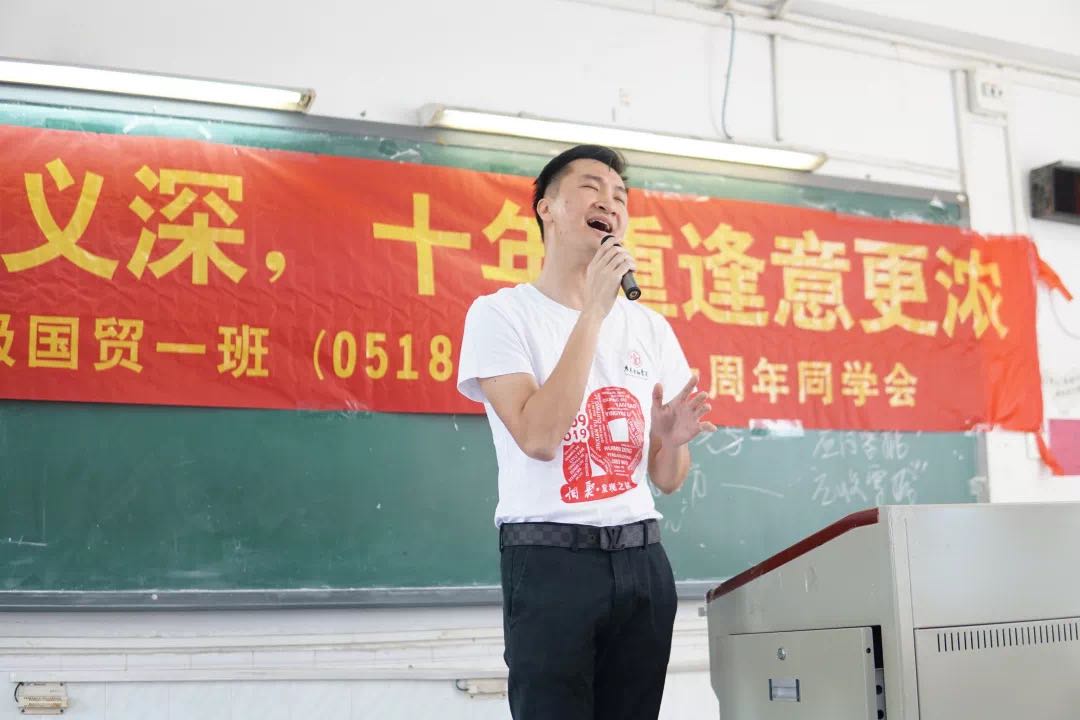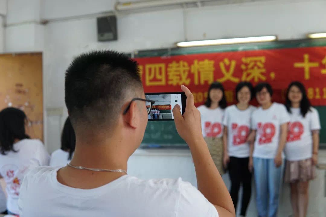校友们又回到了当年上课的教室,那是孕育他们的摇篮。不过在这次的班会课堂上,他们穿上的是“毕业十周年纪念”的T恤。