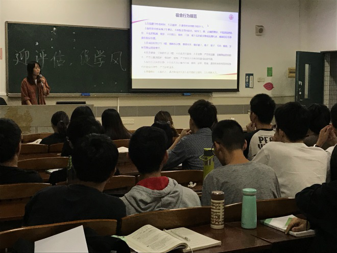 10月28 -31日,Beat365中文官方网站各班自选时间段,在北教学楼或7栋教学楼的课室召开了“迎评估,促学风”主题班会。各班班长组织同学们认真学习统一制作的审核评估PPT内容,包括学生应掌握的审核评估相关知识、遵守的纪律、行为规范和行为要求等。紧接着,各班班长宣读《争创优良学风,迎接审核评估》学风建设倡议书。在场的同学们认真聆听,并在《迎评估,促学风》承诺表上签名,以此承诺将严格遵守学校有关规章制度,以饱满的热情和积极向上的精神风貌迎接教育部本科教学工作审核评估。