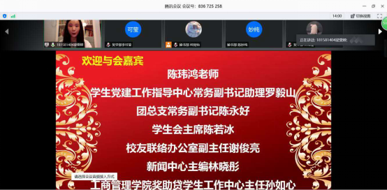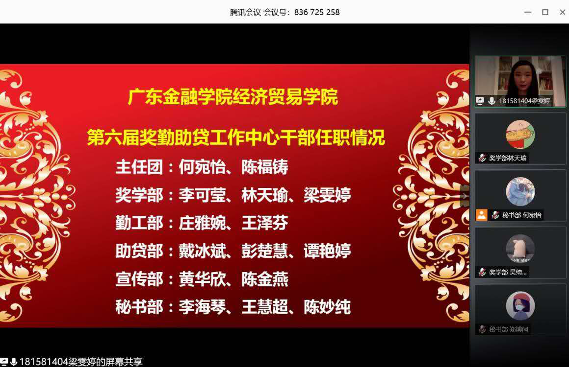 大会开始前10分,奖勤助贷工作中心全体成员预先调试好设备并在腾讯会议上进行签到,全体成员以昂扬的状态迎接这场送旧迎新的表彰暨换届大会,共同见证中心的新启程。