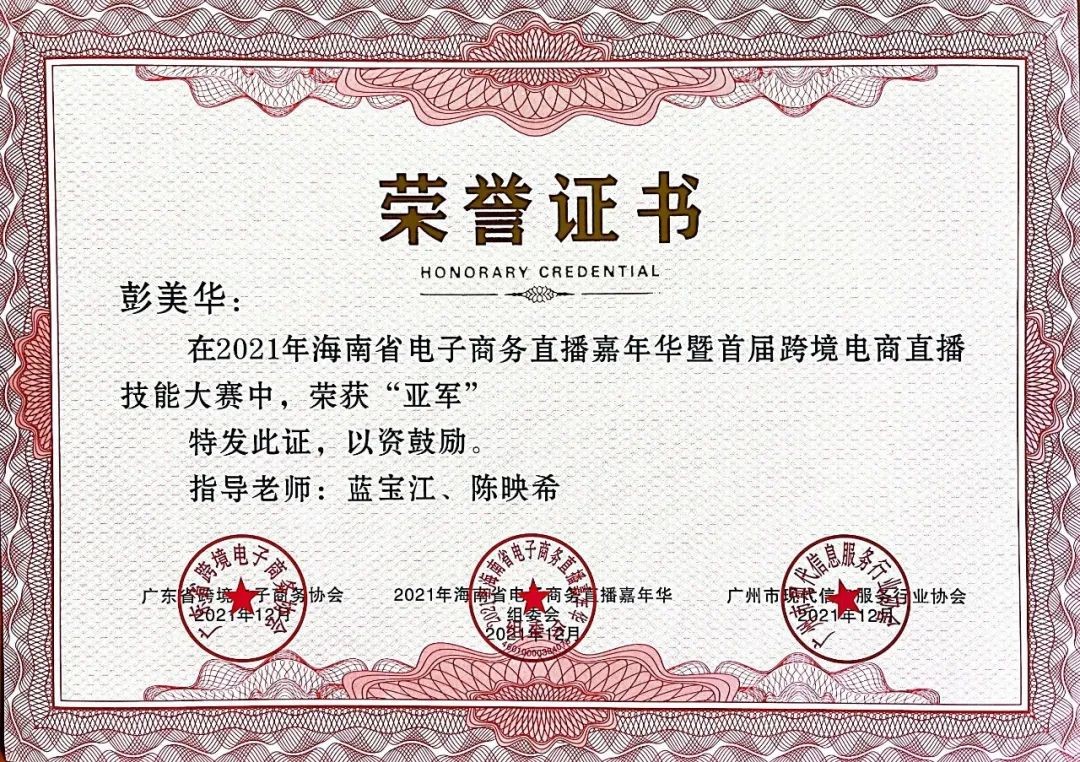 指导2019级本科生彭美华、邓宝瑜,在海南省首届跨境电商直播大赛(院校组)获亚军;本人获得优秀指导教师奖。