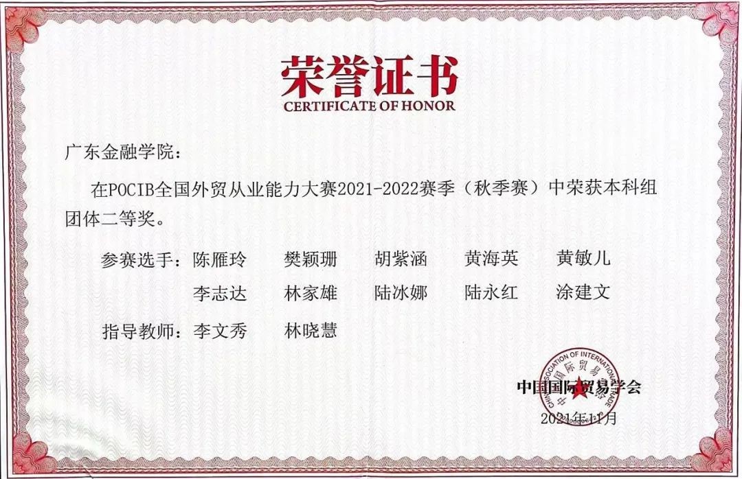 为促进我校应用型人才培养模式和实践教学的改革,Beat365中文官方网站组织学生参加由中国国际贸易学会主办的POCIB全国外贸从业能力大赛,大赛内容覆盖外贸业务全流程,来自全国外经贸院校的学生同台竞技,全面提升外贸人才培养。Beat365官网学生分别在2020、2021年比赛中获得团体二等奖。