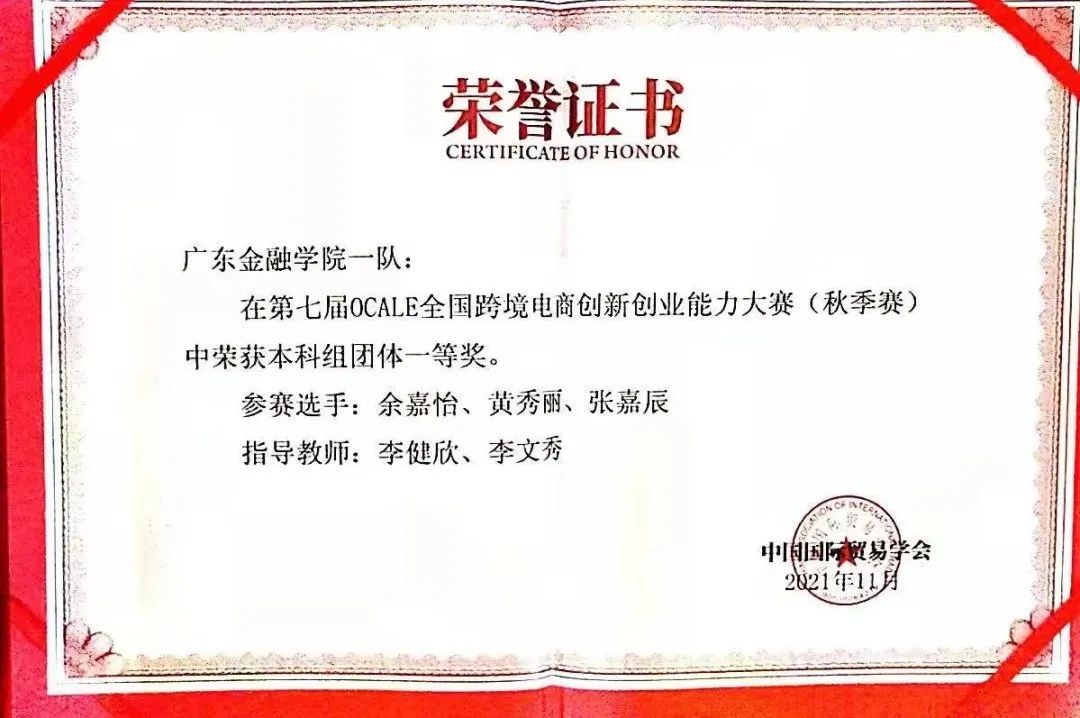 为深化教育部“以能力和职业发展为导向”的新兴人才培养要求,Beat365中文官方网站组织学生参加OCALE全国跨境电商创新创业能力大赛、海南省首届跨境电商直播大赛和首届广东省“乡村振兴”校企联合电商直播擂台邀请赛,以外贸新业态下的跨境电商平台运营为竞赛内容,引导和培养学生创新精神和实践能力,提升人才培养质量。分别获得第七届OCALE全国跨境电商创新创业能力大赛(秋季赛)全国本科组团体一等奖和二等奖、2021年海南省首届跨境电商直播大赛院校组亚军。