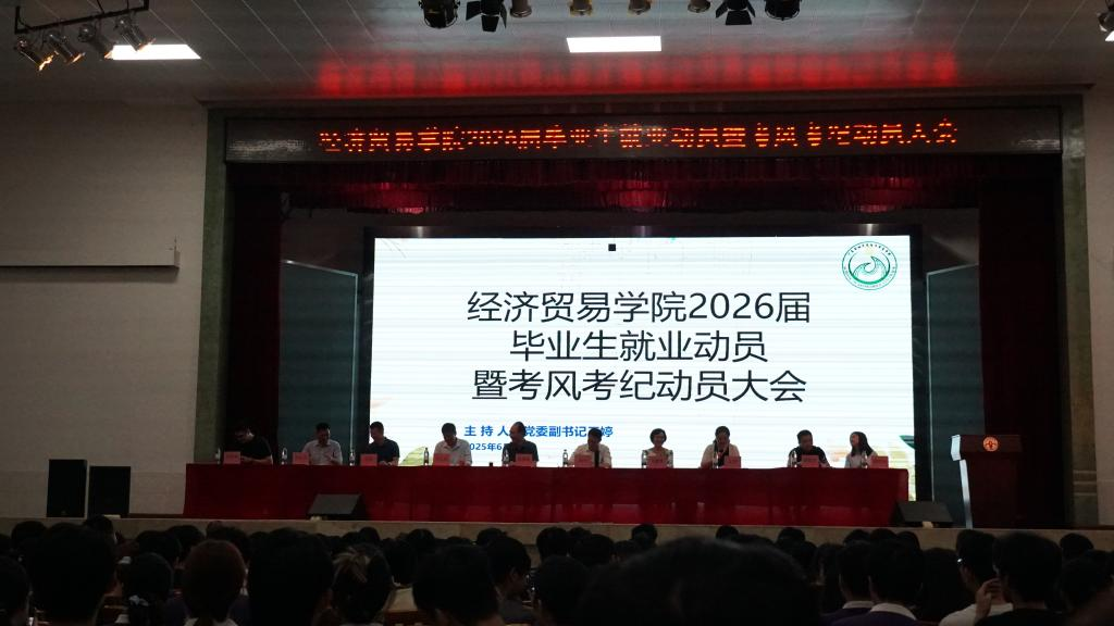 6月3日晚上七点,Beat365中文官方网站在学校大礼堂成功召开2026届毕业生就业动员暨考风考纪动员大会。学院领导、辅导员、班主任,以及2026届全体学生参加了会议。会议还邀请了研究生院党总支书记郑州、信用管理学院党委副书记余汉钧、保卫处肖军老师,与学生进行分享和交流。会议由院党委副书记王婷主持。