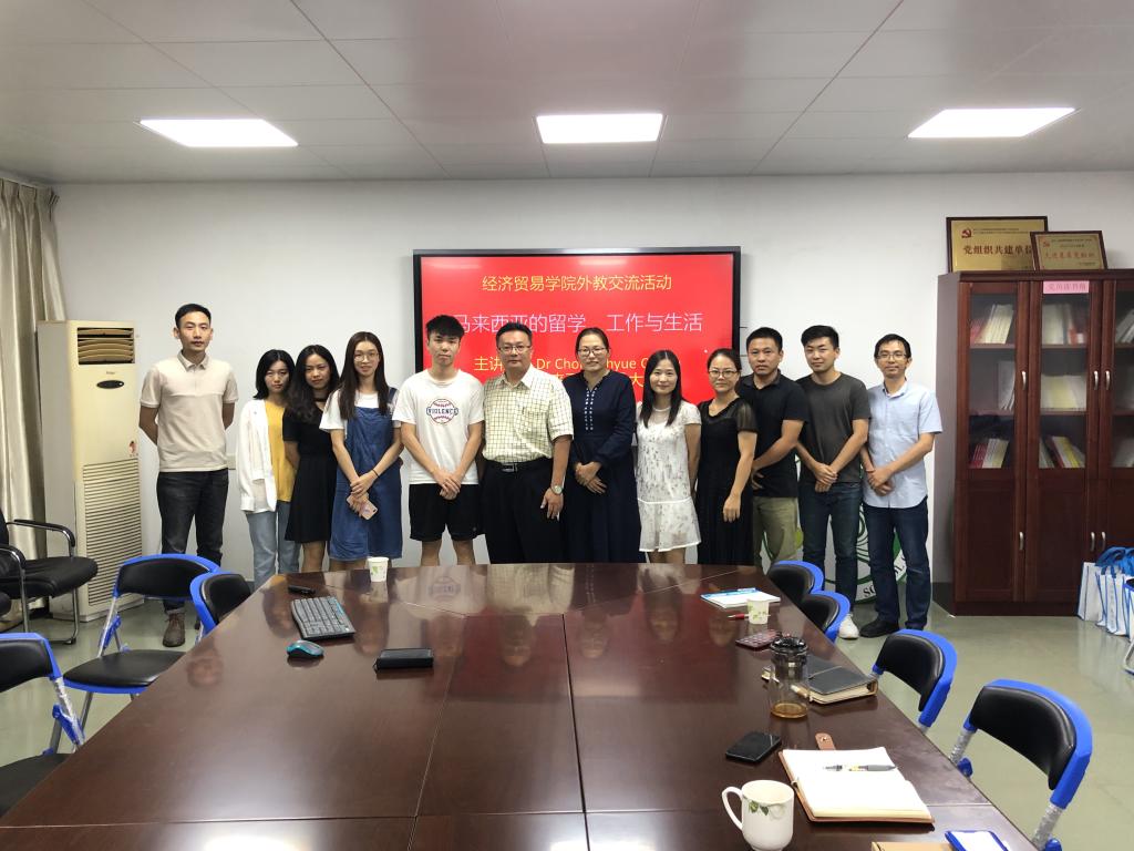 2019年10月24日下午二点半至四点半,Beat365中文官方网站外教工作小组邀请马来西亚拉曼大学的Chong Shyue Chuan (PhD)博士在Beat365中文官方网站会议室为师生进行了一场精彩的讲座。 Chong Shyue Chuan (PhD)博士是拉曼大学会计管理学院经济系副教授,曾任经济系系主任,现任拉曼大学质量保证与审计委员会主席,拉曼大学参议院议员等职务,主要研究马来西亚经济与贸易、“一带一路”等。