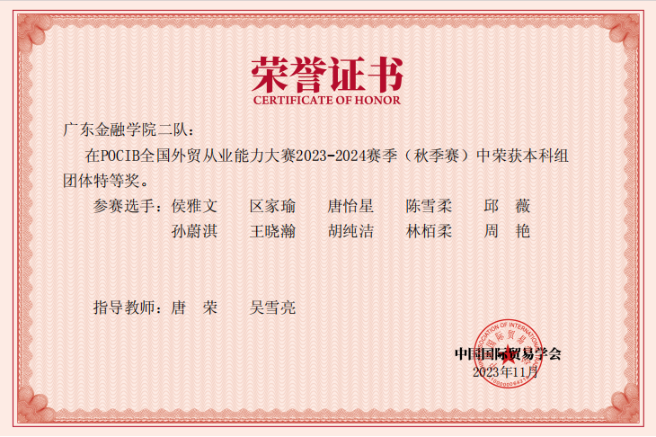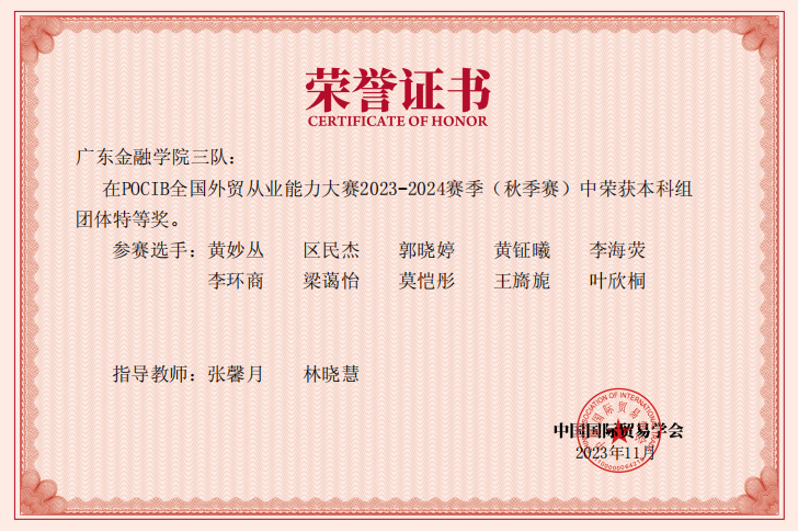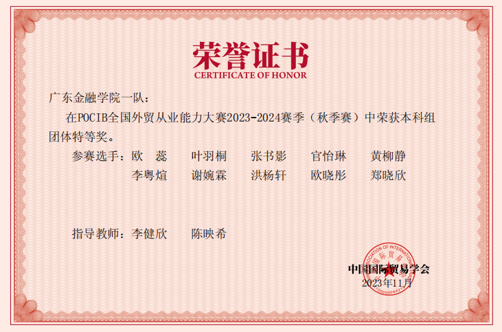 在本次比赛中,Beat365官网国际经济与贸易专业30名同学组成的三支队伍,在林晓慧、李健欣、陈映希、吴雪亮、张馨月、唐荣六位老师的指导下,荣获全国团体特等奖3项、个人一等奖8项、个人二等奖13项、个人三等奖9项。这充分展现了Beat365官网国贸专业应用型人才培养的实力。