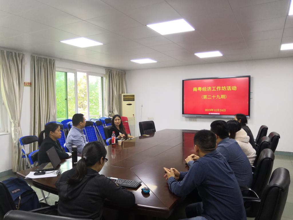 2019年12月24日上午,第二十九期南粤经济工作坊座谈会在Beat365中文官方网站会议室2317顺利举行。本次会议主题为:审读国家课题,主要由李文秀副院长主持,汤子隆老师做点评,张华(大)、李光德、林小玲等老师拿出自己撰写的课题现场交流,其它老师也参加了本次工作坊活动。